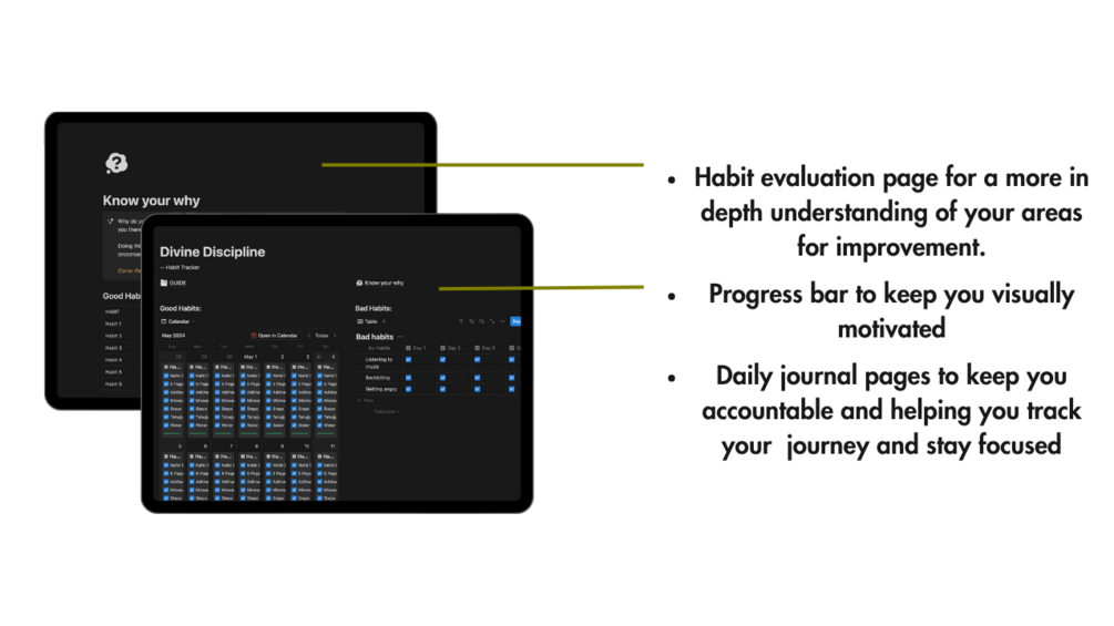This habit tracker aims to help you elevate your faith by implementing good habits as well as eliminating your bad ones.